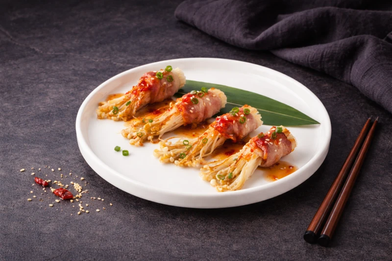 Грибы эноки, обернутые сочным беконом, обжаренные до золотистой корочки, подаётся с тайским чили и соусом скияки, посыпаны ароматным кунжутом